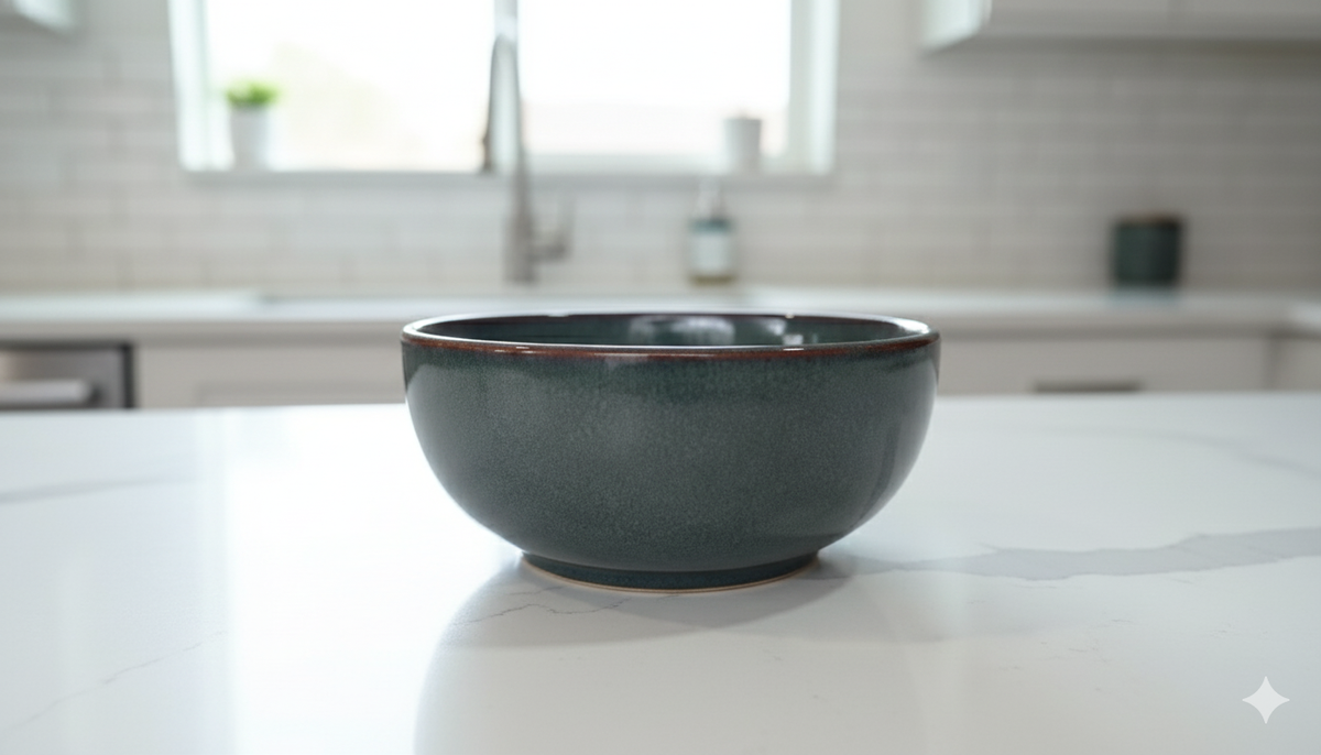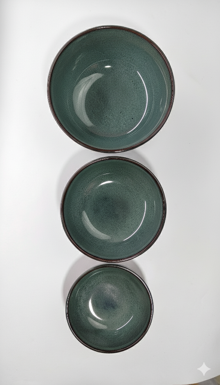 This elegant stoneware bowl features a captivating deep teal or petrol blue glaze with a subtle, variegated speckle, giving it a rich, organic texture. The glaze transitions beautifully, showcasing slight variations in shade that enhance its handcrafted appeal. A contrasting rustic brown-red rim provides a refined border, adding warmth and defining its classic, gently rounded form. Perfect for serving soups, cereals, or side dishes, its sturdy yet sophisticated design makes it a versatile addition to any table setting.
